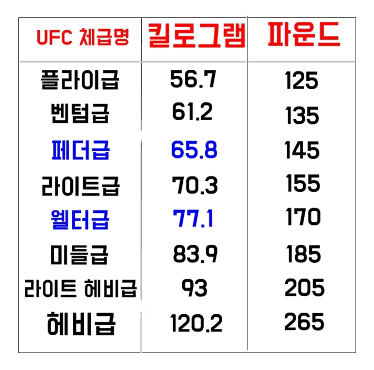 현재 UFC 남성부는 총 8개 체급으로 나뉘며, 모든 체급은 파운드(lb) 기준이에요. 1파운드는 약 0.45kg 정도로 계산해요. 각 체급은 10~20파운드 단위로 나뉘며, 웨이트 인(계체)에서 기준 체중을 맞춰야 경기에 출전할 수 있어요.